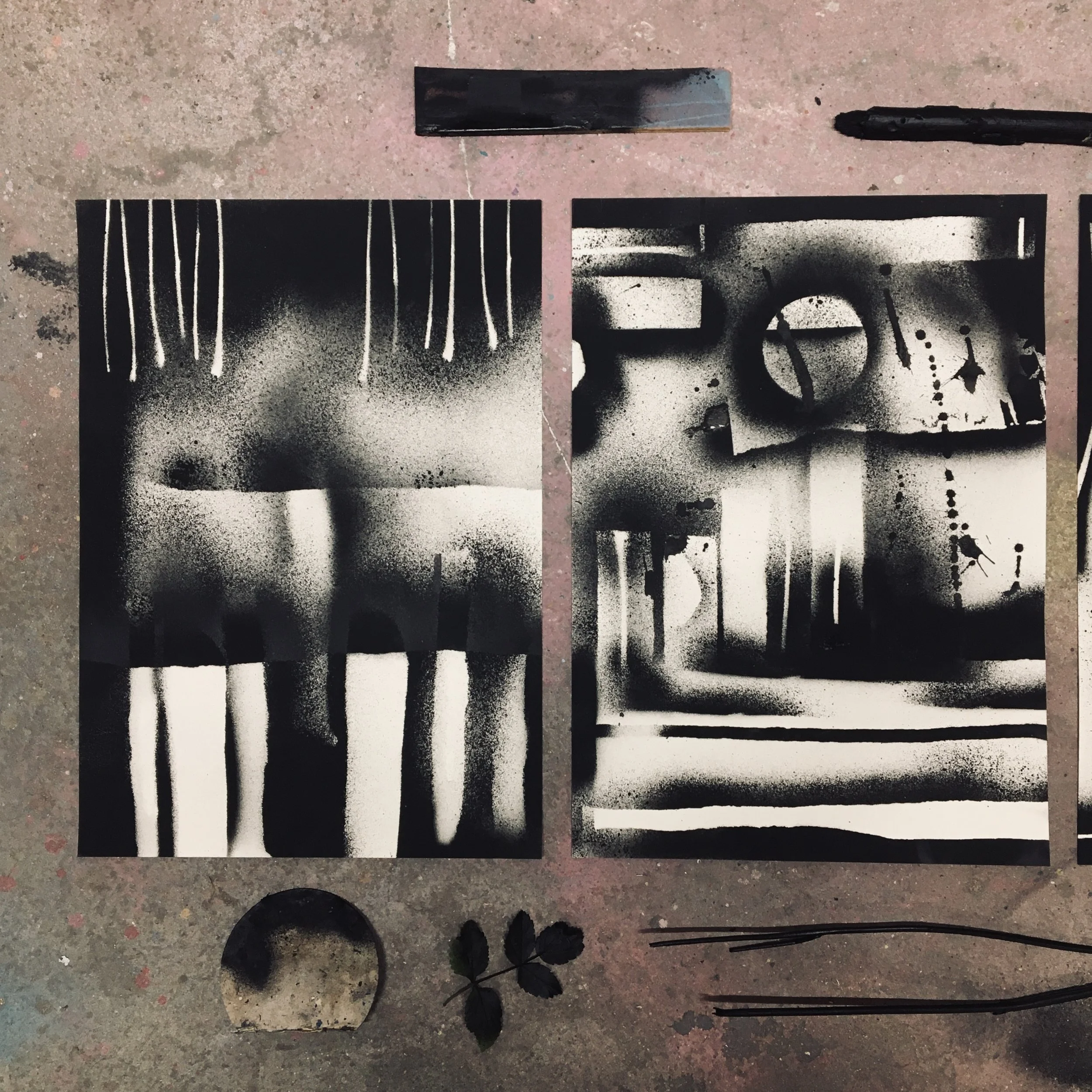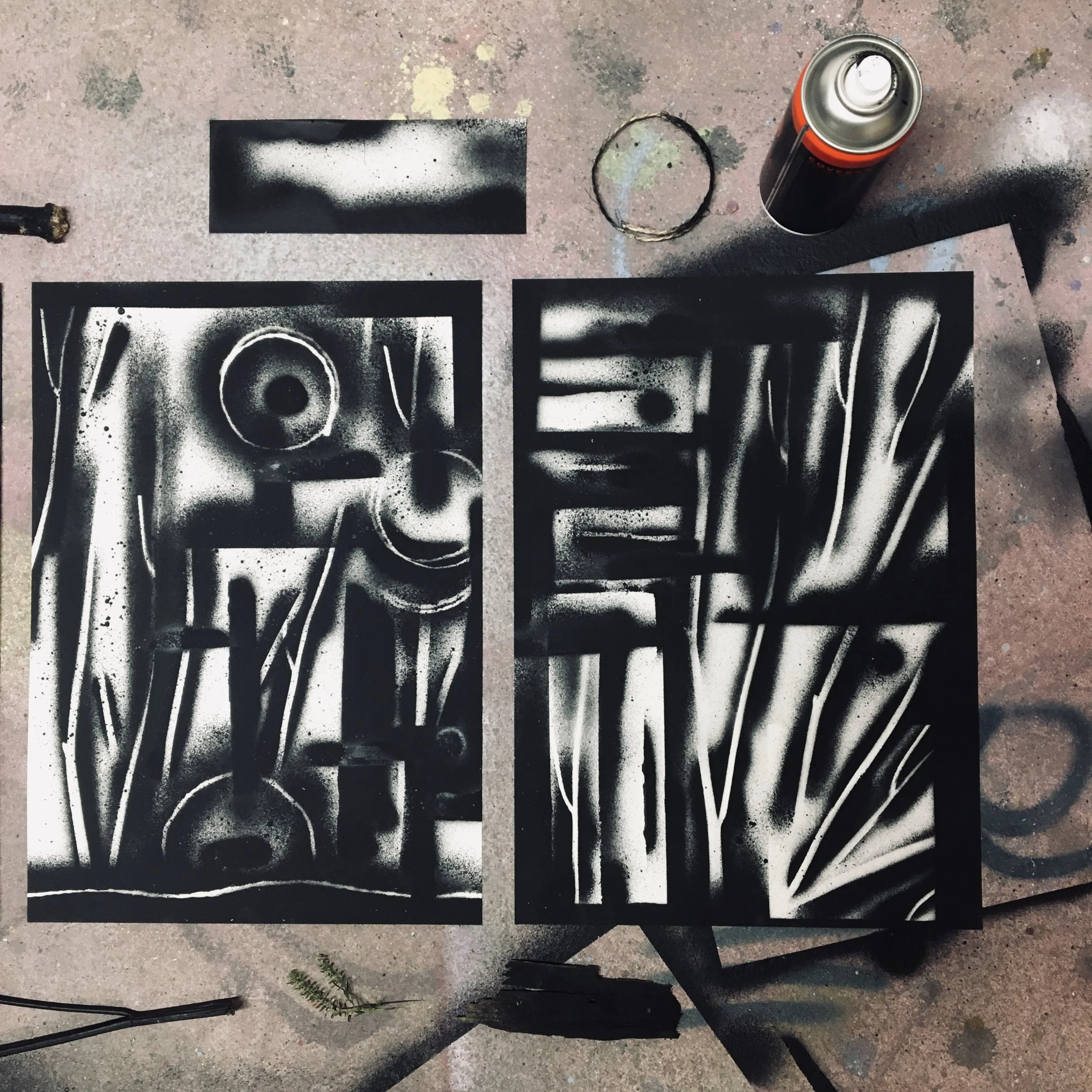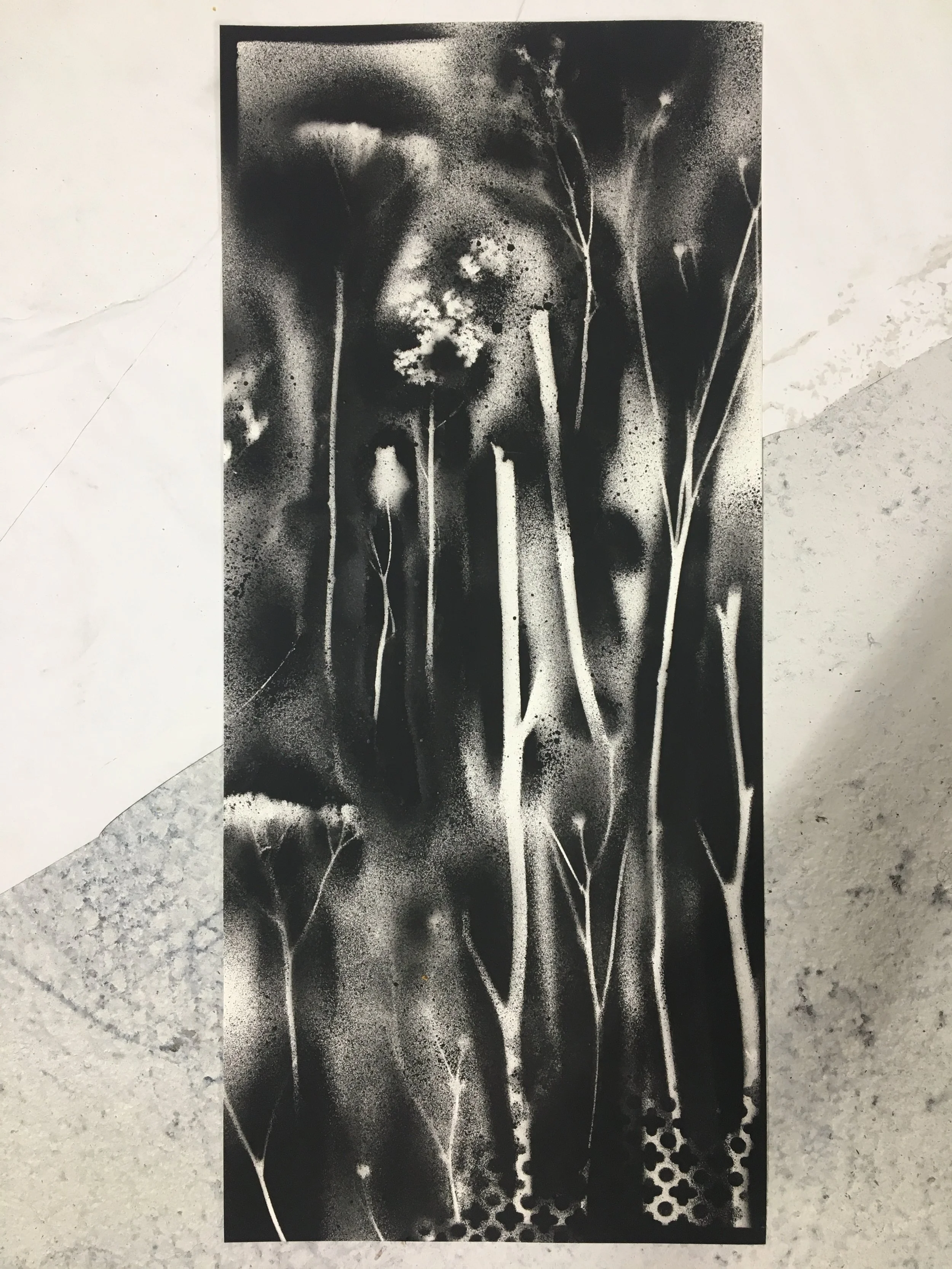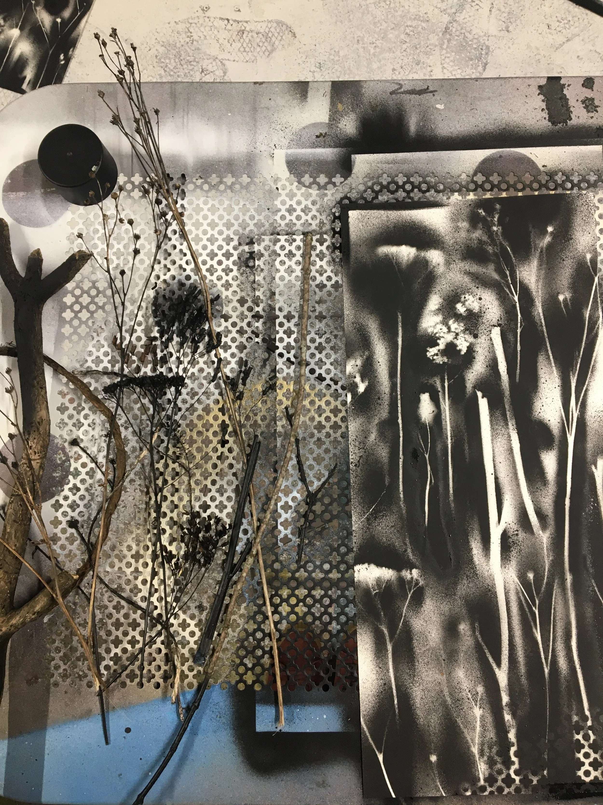 EMPREINTESExpérimentations plastiques. Végétaux et objets deviennent pochoirs et ombrages. Spray sur papier - 2022
