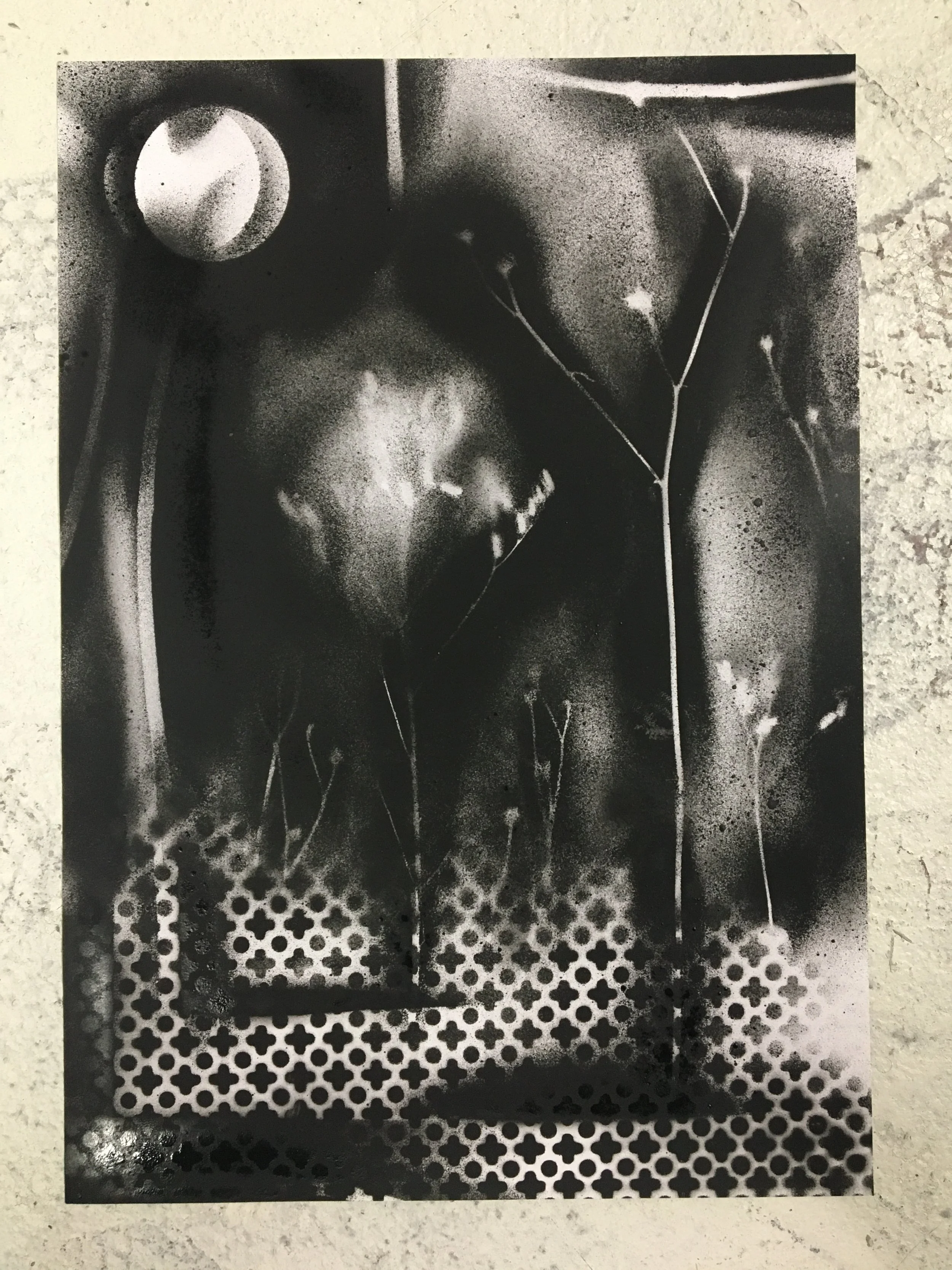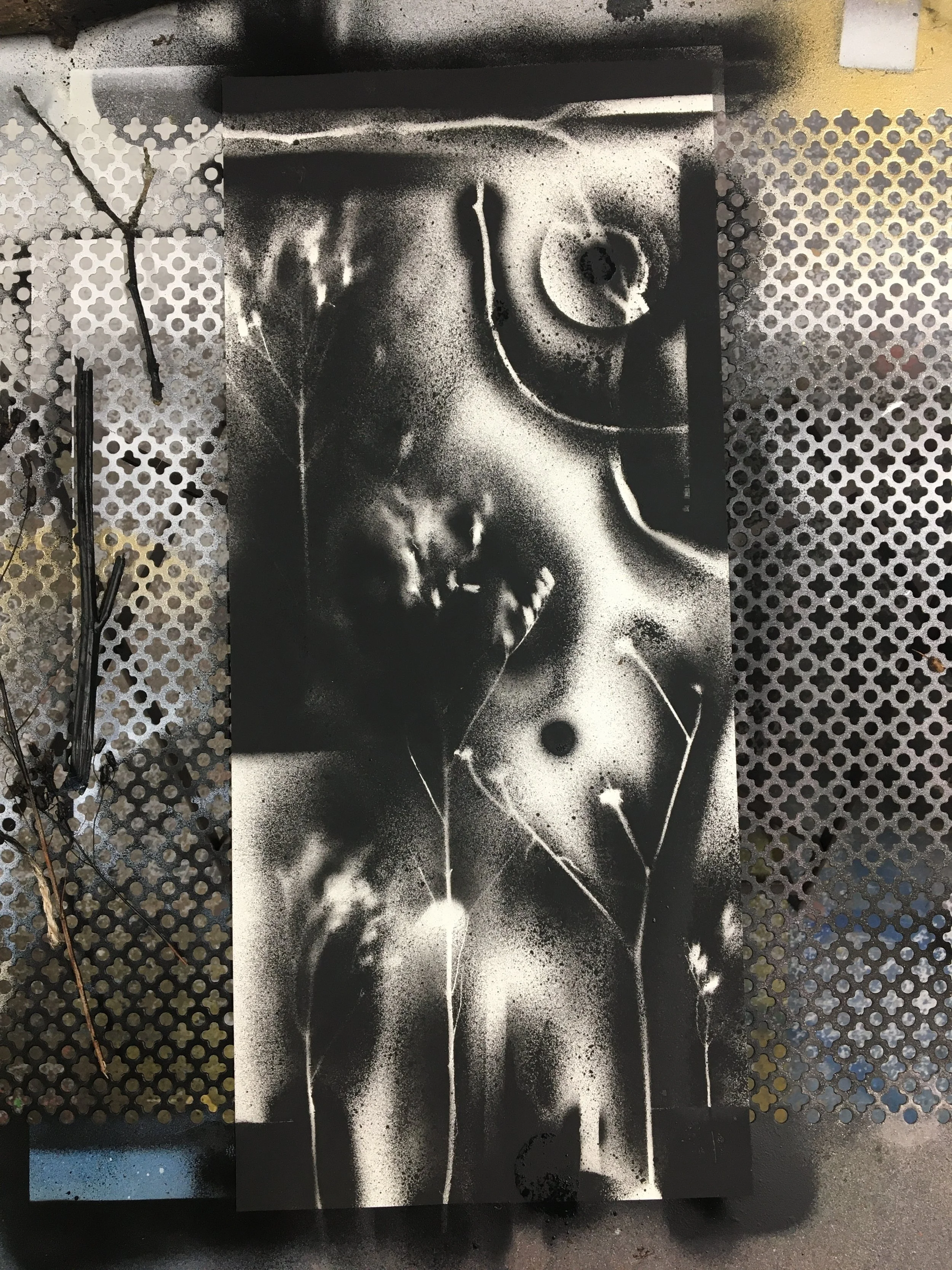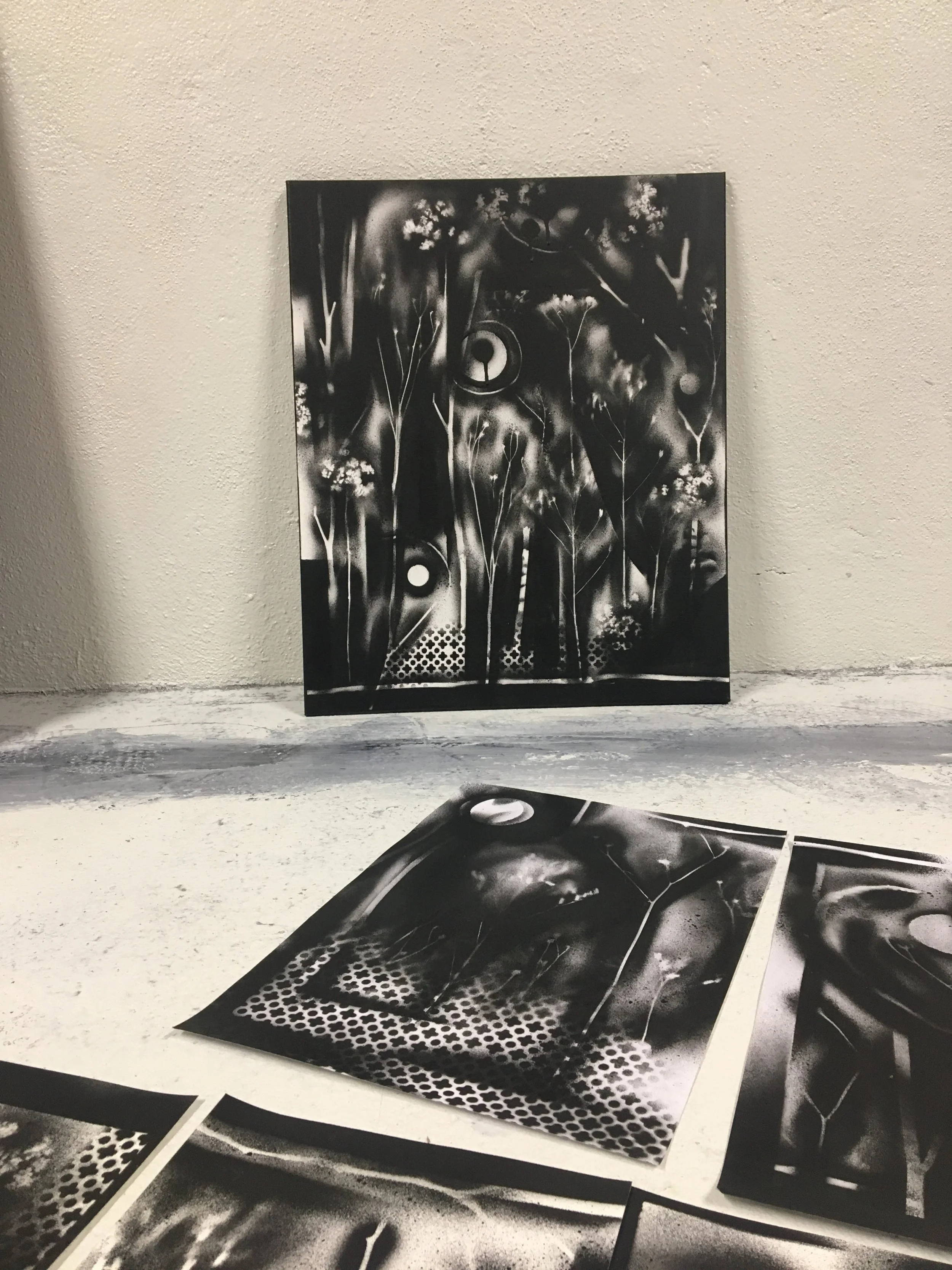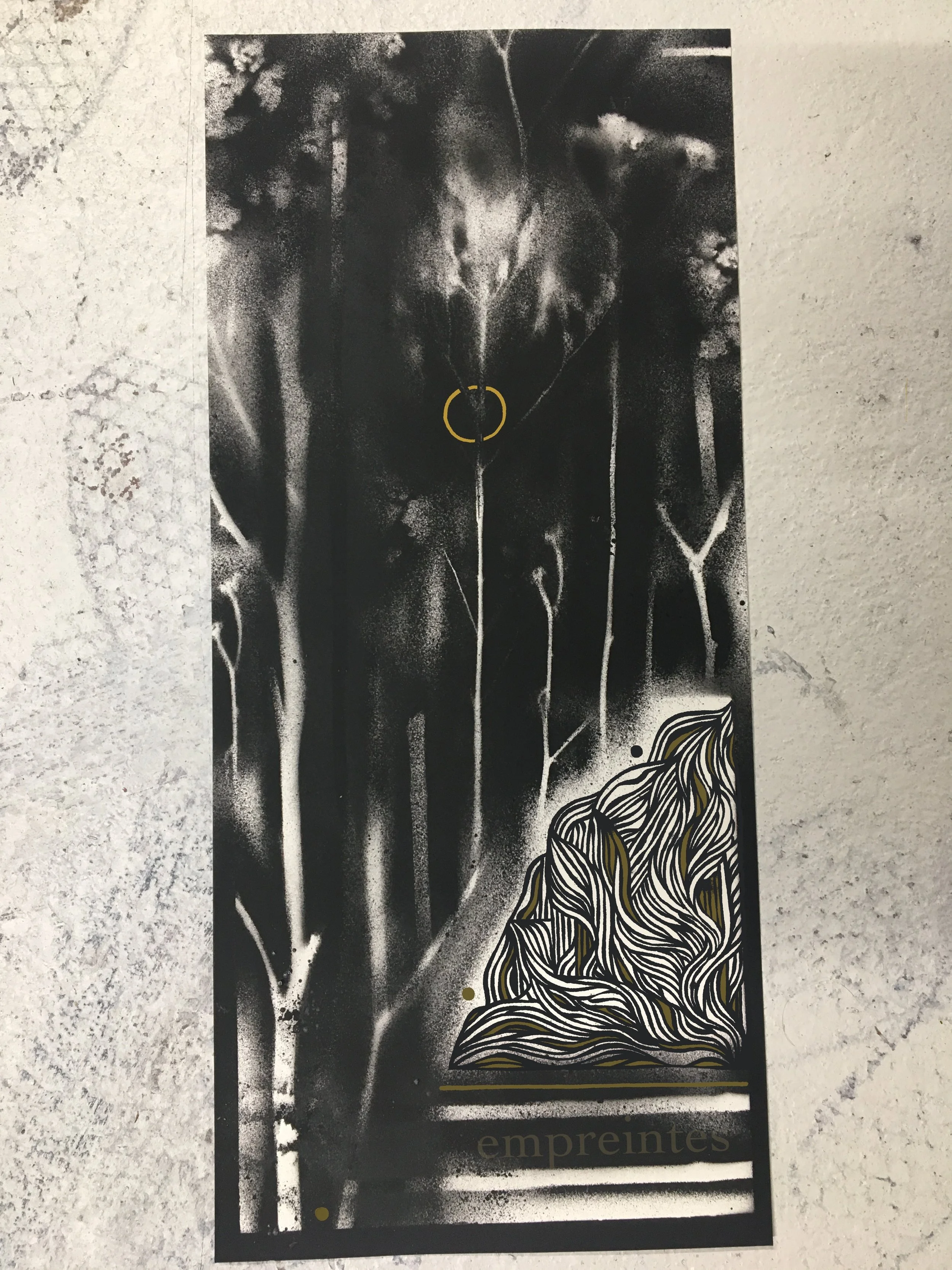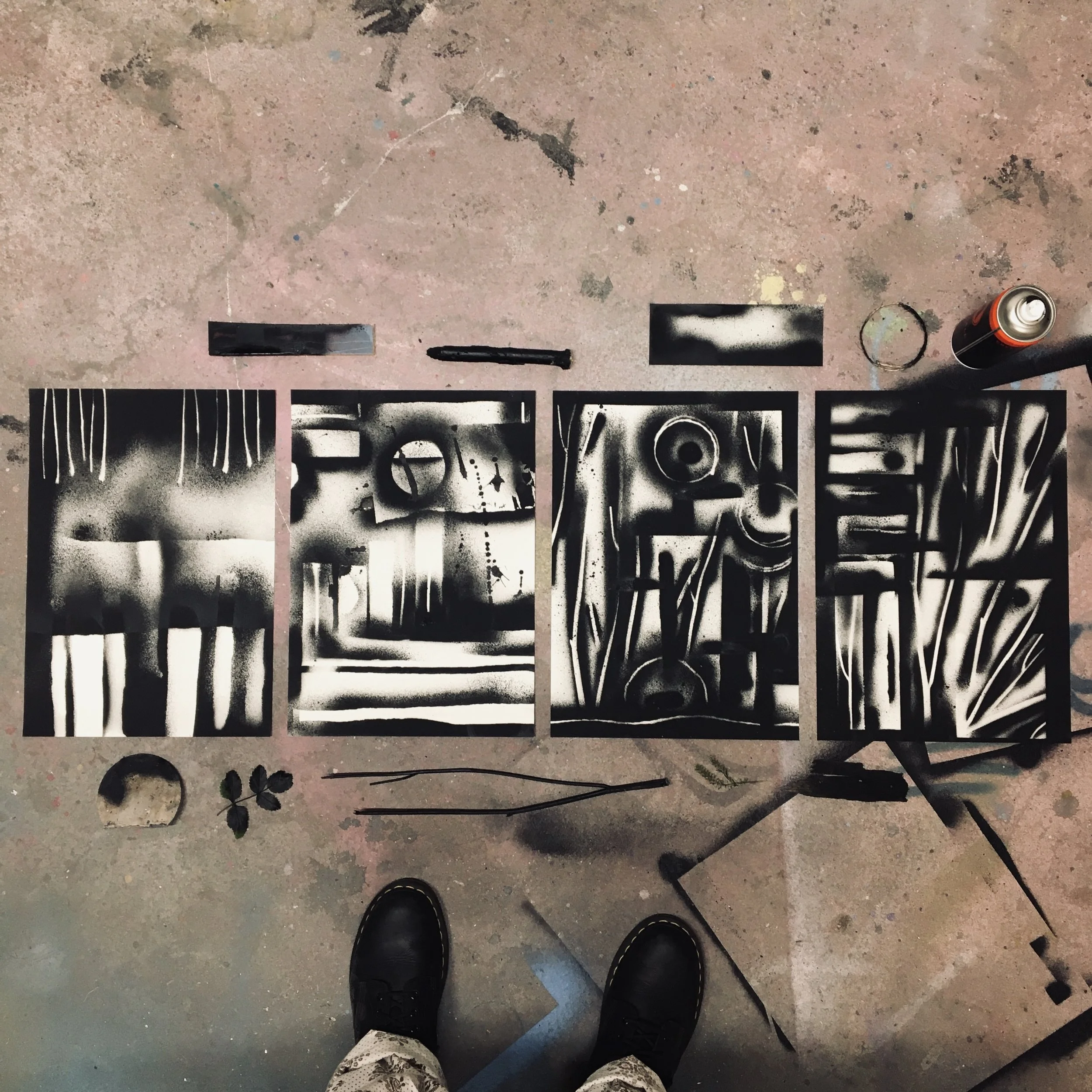 EMPREINTESExpérimentations plastiques. Végétaux et objets deviennent pochoirs et ombrages. Spray sur papier - 2022